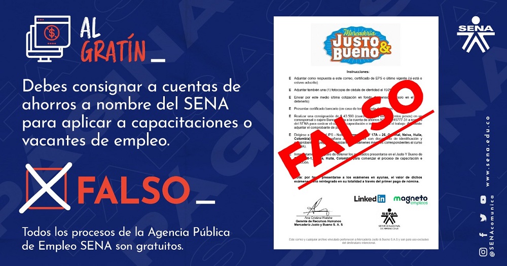 Por eso es conveniente que la ciudadanía sepa y tenga claro que los servicios que brinda la regional SENA Huila a toda la población son gratuitos y no requieren de intermediarios y recomienda no participar en ofertas de empleo que incluyan la consignación de dinero para exámenes médicos u otros trámites.